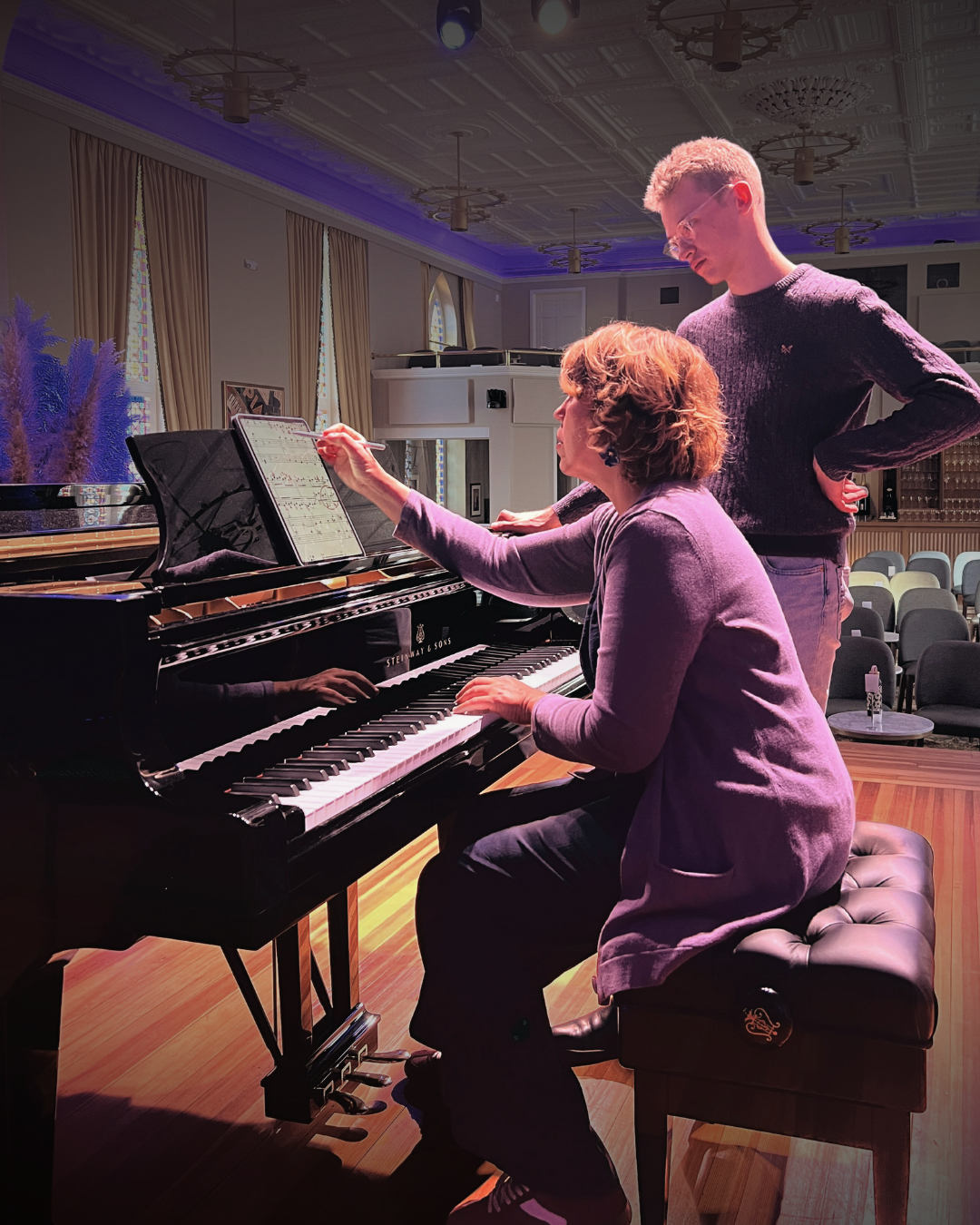 Composing Fellows workshop their solo compositions with professional performers Juliette Kang (First Associate Concertmaster, Philadelphia Orchestra), Clara Warnaar (Vibraphone, International Contemporary Ensemble), and Zachary Feingold (Bassoon, Chamber Orchestra of Philadelphia).